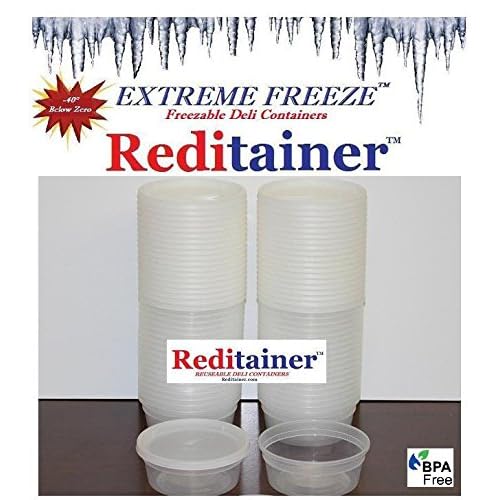Perfect for meal prepping multiple meals at once, freezing in the freezer, microwaving (no lid), then washing in the dishwasher (recommended top rack) before next use. Control your portions and count your macros! Our meal prep containers are airtight and leak-resistant. They can be reused more often than those made by many of our competitors. More details: Food-safe: only high-quality, food-grade virgin polypropylene is used. Toxin-free: contain no BPA, phthalates or toxic additives. Made in Ontario, Canada to strict FDA and CFIA guidelines. Microwave (no lid) & Dishwasher safe. Comes with our meal prepping ebook giving you tips, and recipes.the Reditainer Extreme Freeze Deli Food Containers with Lids, 8-Ounce, 40-Pack The innovative square shape of Easy Find Lids containers means more food storage can fit into your refrigerator, pantry or cooler at the same time. When empty, containers easily nest and stack.Find the right lid, right now! Featuring the Rubbermaid Easy Find Lids system, lids snap to the container base and other lids so that the right lid is always at your fingertips. The square-shape, graduated sized containers give you more space in the fridge or cupboard. Organizing your kitchen just got easier.Reditainer Extreme Freeze Deli Food Containers with Lids, 8-Ounce, 40-Pack is best for youExtreme Freeze Reditainer 8 ounce Freezable Deli Containers. Package of 40 with tight fitting lids. Designed especially for Freezing, capable of withstanding temperature to ( - 40 degrees ) for extended periods of time. Stackable engineered polypropylene plastic. Microwaveable and Dishwasher safe.