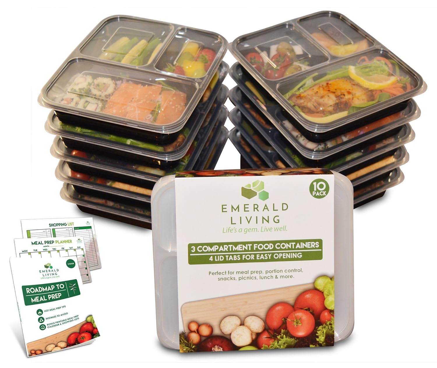 Perfect for meal prepping multiple meals at once, freezing in the freezer, microwaving (no lid), then washing in the dishwasher (recommended top rack) before next use. Control your portions and count your macros! Our meal prep containers are airtight and leak-resistant. They can be reused more often than those made by many of our competitors. More details: Food-safe: only high-quality, food-grade virgin polypropylene is used. Toxin-free: contain no BPA, phthalates or toxic additives. Made in Ontario, Canada to strict FDA and CFIA guidelines. Microwave (no lid) & Dishwasher safe. Comes with our meal prepping ebook giving you tips, and recipes.the |10 pack| 3 Compartment Meal Prep Food Containers Bento Box Set with Lids. Dishwasher, Microwave & Freezer Safe. Stackable, Reusable & BPA Free Plastic Food Storage / Lunch Box Containers + EBook The innovative square shape of Easy Find Lids containers means more food storage can fit into your refrigerator, pantry or cooler at the same time. When empty, containers easily nest and stack.Find the right lid, right now! Featuring the Rubbermaid Easy Find Lids system, lids snap to the container base and other lids so that the right lid is always at your fingertips. The square-shape, graduated sized containers give you more space in the fridge or cupboard. Organizing your kitchen just got easier.|10 pack| 3 Compartment Meal Prep Food Containers Bento Box Set with Lids. Dishwasher, Microwave & Freezer Safe. Stackable, Reusable & BPA Free Plastic Food Storage / Lunch Box Containers + EBook is best for youPackage Quantity:10 | Size:3 Compartment LIFE'S A GEM, LIVE WELL. THAT'S OUR MOTTO AT EMERALD LIVING . QUALITY PRODUCTS FOR QUALITY LIVING. Meal prep in style with these compact, stylish and lightweight bento box food storage containers. Portion control with 3 compartment divider plate design for a fitter healthy you! Versatile and multipurpose, these organisers can be used as containers for meal prep, lunch boxes, snacks, picnics, barbeques (BBQ), relatives' meals, foodsavers, parties and more! YOUR BUY: o Ten 3 Compartment containers with lids. 36 fl. oz. o Bonus meal prep eBook with great resources WE STRIVE FOR QUALITY & VALUE IN ALL OUR PRODUCTS. HERE'S WHY OURS ARE THE BEST BUY: o Easiest to open 4 lid tab design o Flat compact lids. Save space, store and stack easily o Free eBook & meal prep resources o Multibuy discount - best value for money o 36 fl oz volume - more than 32 oz. alternatives o FDA & SGS certified o BPA free o Moneyback guarantee & warranty o Tightly boxed for delivery protection o Safe for dishwasher, freezer & microwave o Multipurpose bulk 10 pack o Strong & light recyclable polypropylene (PP) plastic USE: o Rinse before first use o Avoid overfilling - this can stretch lids o Dishwashers - top rack is optimal o Microwave - don't seal food closed when using o Seal - close well for airtight seal. Not designed for pure liquids Our 90 day no questions asked moneyback guarantee and 12 month warranty let you buy with peace of mind. DON'T MISS OUT, ADD TO BASKET NOW!