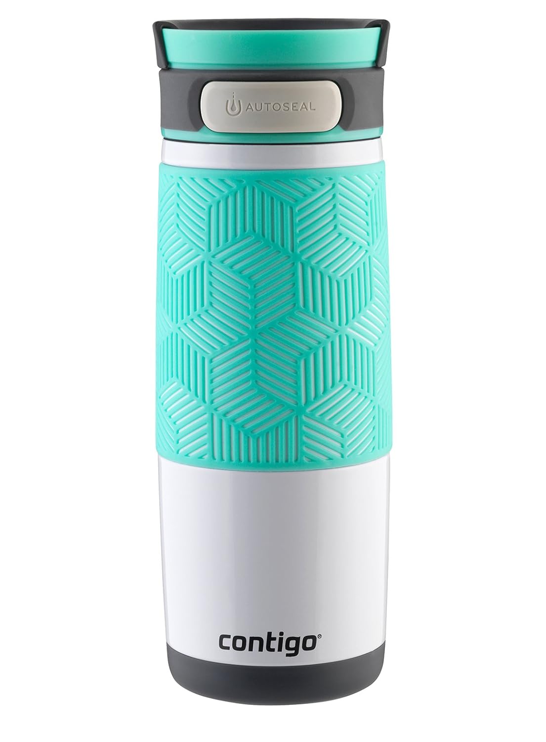 • The Contigo AUTOSEAL Transit Stainless Steel Travel Mug, 16 oz, Polar White with Grayed Jade Lid Accent is a