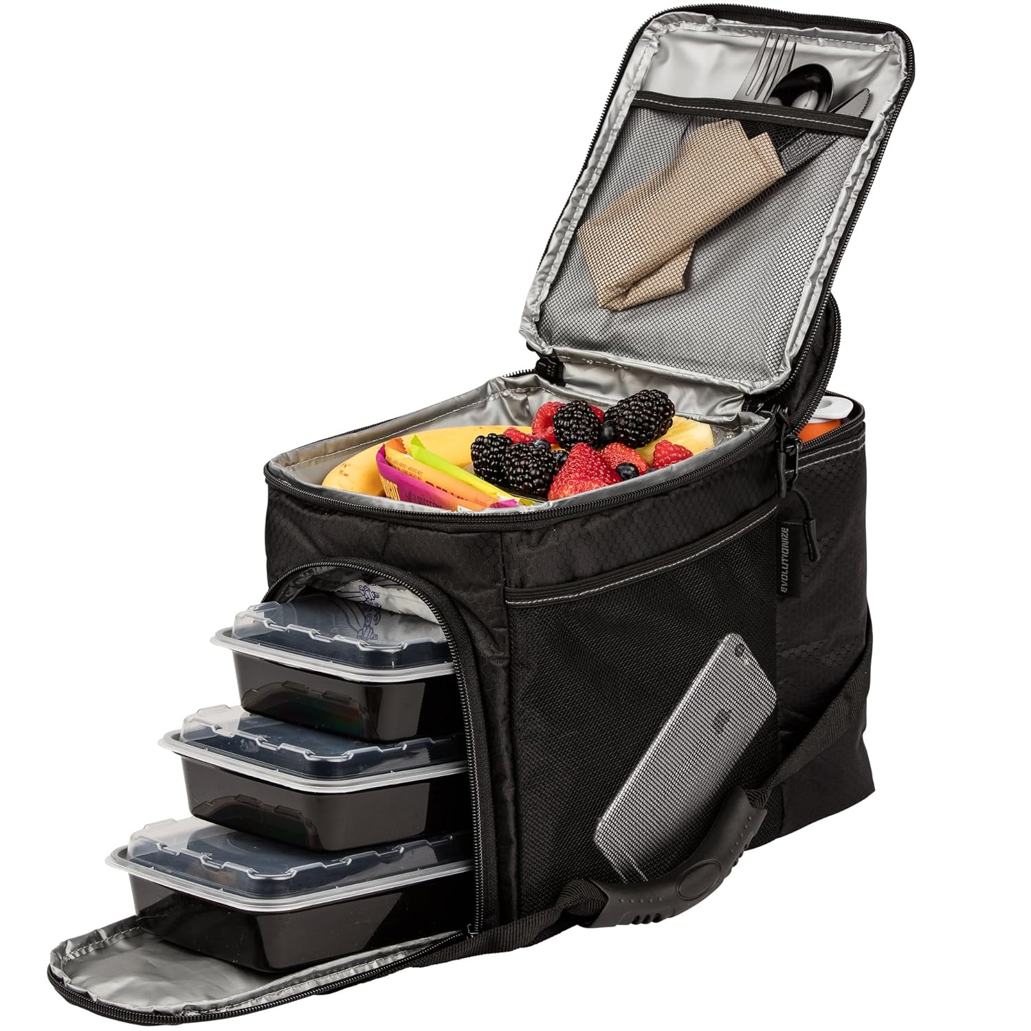 • The EDC Meal Prep Bag by Evolutionize - Full Meal Management System includes Portion Control Meal Prep Containers + Ice Pack (3 Meal, Black/Black) - Patent Pending is a