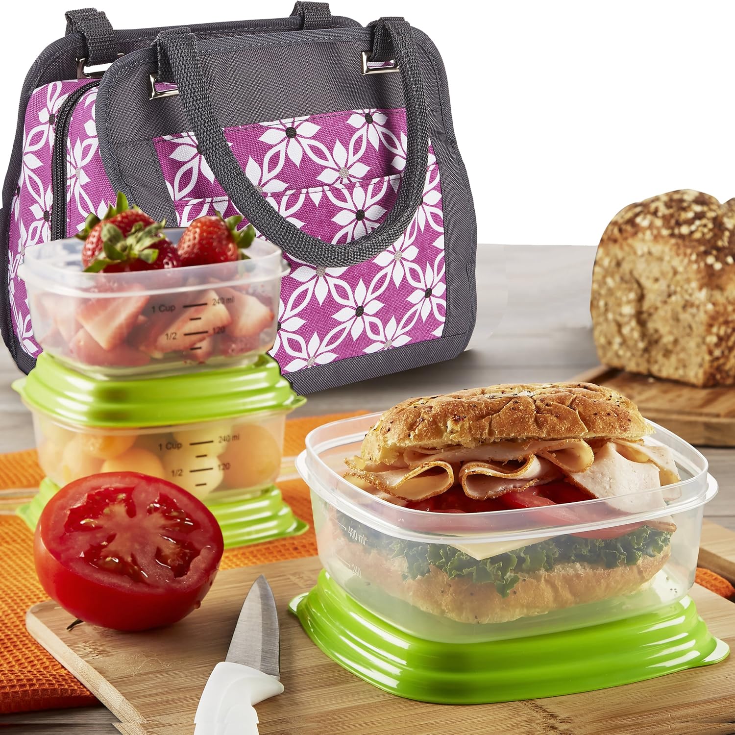 Perfect for meal prepping multiple meals at once, freezing in the freezer, microwaving (no lid), then washing in the dishwasher (recommended top rack) before next use. Control your portions and count your macros! Our meal prep containers are airtight and leak-resistant. They can be reused more often than those made by many of our competitors. More details: Food-safe: only high-quality, food-grade virgin polypropylene is used. Toxin-free: contain no BPA, phthalates or toxic additives. Made in Ontario, Canada to strict FDA and CFIA guidelines. Microwave (no lid) & Dishwasher safe. Comes with our meal prepping ebook giving you tips, and recipes.the Fit & Fresh Ashland Lunch Bag Kit with Reusable Container Set and Ice Pack, Orchid Dogwood The innovative square shape of Easy Find Lids containers means more food storage can fit into your refrigerator, pantry or cooler at the same time. When empty, containers easily nest and stack.Find the right lid, right now! Featuring the Rubbermaid Easy Find Lids system, lids snap to the container base and other lids so that the right lid is always at your fingertips. The square-shape, graduated sized containers give you more space in the fridge or cupboard. Organizing your kitchen just got easier.Fit & Fresh Ashland Lunch Bag Kit with Reusable Container Set and Ice Pack, Orchid Dogwood is best for youColor:Orchid Dogwood The Ashland offers hours of insulation in a simple and elegant design. Featuring two straps that allow the bag to worn comfortably on the arm or clutched in hand. A zipper closure reaches down the side of the bag to open and expand to a gray PEVA-line interior that makes cleaning effortless. An exterior pocket is perfect for small belongings and an interior mesh pocket is perfect for holding the included ice pack to keep your meals insulated for hours. Included within the lunch kit comes a set of fresh select favorites. (1) sandwich container, (2) side containers and (1) large reusable ice pack provide you with everything you need to pack and preserve a well-balanced lunch while on the go. All components of the Ashland lunch kit are completely nontoxic, BPA free and pvc free. The reusable fresh selects containers and lids are microwave, freezer and top rack dishwasher safe.