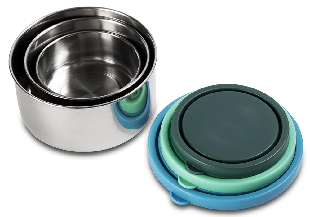 Perfect for meal prepping multiple meals at once, freezing in the freezer, microwaving (no lid), then washing in the dishwasher (recommended top rack) before next use. Control your portions and count your macros! Our meal prep containers are airtight and leak-resistant. They can be reused more often than those made by many of our competitors. More details: Food-safe: only high-quality, food-grade virgin polypropylene is used. Toxin-free: contain no BPA, phthalates or toxic additives. Made in Ontario, Canada to strict FDA and CFIA guidelines. Microwave (no lid) & Dishwasher safe. Comes with our meal prepping ebook giving you tips, and recipes.the MIRA Set of 3 Stainless Steel lunch box and food storage containers, Multi Color The innovative square shape of Easy Find Lids containers means more food storage can fit into your refrigerator, pantry or cooler at the same time. When empty, containers easily nest and stack.Find the right lid, right now! Featuring the Rubbermaid Easy Find Lids system, lids snap to the container base and other lids so that the right lid is always at your fingertips. The square-shape, graduated sized containers give you more space in the fridge or cupboard. Organizing your kitchen just got easier.MIRA Set of 3 Stainless Steel lunch box and food storage containers, Multi Color is best for youColor:Blue/Emerald/Teal Reusable, nesting trio stainless steel containers with leak-proof lids. BPA, Pthalate, PVC and lead free products can be used as a lunch box or a snack box Uses - Great for packing snacks for kids or lunches on the go. Great for portion control. Use these stainless steel boxes as storage containers for left-overs. Food containers provide ample food storage without bulking up your backpack, handbag or lunchbox, and our kid-friendly lids are easy to snap on and off. What's included - A generous-sized 16-once large container, an 8-ounce medium size container, and a 5-ounce small size. Our trio offers 'exactly right' options for transporting a sandwich, sliced fresh veggies, or a slice of tasty cake, (or, all three!) safely and easily. Better yet, our durable waterproof containers nest inside one another for easy storage when you are ready to tuck them away.