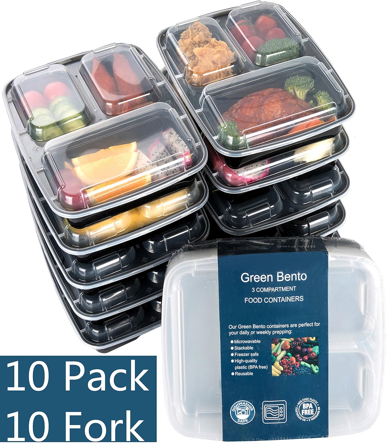 Perfect for meal prepping multiple meals at once, freezing in the freezer, microwaving (no lid), then washing in the dishwasher (recommended top rack) before next use. Control your portions and count your macros! Our meal prep containers are airtight and leak-resistant. They can be reused more often than those made by many of our competitors. More details: Food-safe: only high-quality, food-grade virgin polypropylene is used. Toxin-free: contain no BPA, phthalates or toxic additives. Made in Ontario, Canada to strict FDA and CFIA guidelines. Microwave (no lid) & Dishwasher safe. Comes with our meal prepping ebook giving you tips, and recipes.the [10 Pack]3 Compartment Meal Prep Food Storage Containers with Lids/BPA Free Bento Lunch Boxes/Divided Portion Control Container Plates-Microwave, Dishwasher Safe, Free Cutlery The innovative square shape of Easy Find Lids containers means more food storage can fit into your refrigerator, pantry or cooler at the same time. When empty, containers easily nest and stack.Find the right lid, right now! Featuring the Rubbermaid Easy Find Lids system, lids snap to the container base and other lids so that the right lid is always at your fingertips. The square-shape, graduated sized containers give you more space in the fridge or cupboard. Organizing your kitchen just got easier.[10 Pack]3 Compartment Meal Prep Food Storage Containers with Lids/BPA Free Bento Lunch Boxes/Divided Portion Control Container Plates-Microwave, Dishwasher Safe, Free Cutlery is best for youPackage Quantity:10 | Size:3-Compartment -Design The clear microwave cover for food display your delicious food inside of your portion plate set; All food trays with snap-lock lids help keeping food fresh. Good insulation properties heating food up or cool them down. The bento lunch boxes are reusable, stackable, microwave safe. The long term food storage containers are created to withstand the microwave and dish washing machine. The divided containers are not as strong as Tupperware or hard plastic. But the food containers are reusable, under a recommended gentle hand wash. If you are dieting and want to control portion. Or you want to ensure a healthy eating habit of your kids while at school. The food storage containers with lids are ideal for daily meal prep. Each one can grab their bento lunch containers set and go. Convenient to carry snacks and leftovers such as Chinese, Indian, or Sushi. The 3 compartments food containers allow you to pack foods in healthy portion and cut down on lunch expenses. -For Adults/Kids Designed with eco-friendly, easy-open lids, NOT LEAK PROOF; the easy to carry bento containers allows you to bring food to work or school and eat healthy meals. Or carry to the outside, such as picnic or travel. Your bento lunch pack box is easy to load up on the veggies and keep the tasty indulgences to a proper amount. Dividing your lunch in 3 compartments helps you achieve your diet and weight management goals. The convenient food saver box can help you lead a healthy life by enjoying your DIY food. -Suggestions & Package Before microwaving, open a lid corner to allow steam to vent. The portion control food plate containers are wrapped in a paper sleeve detailing the multi virtues of these divided lunch food containers. The healthy bento boxes are: BPA free, dishwasher safe, freezer safe, Non-toxic.