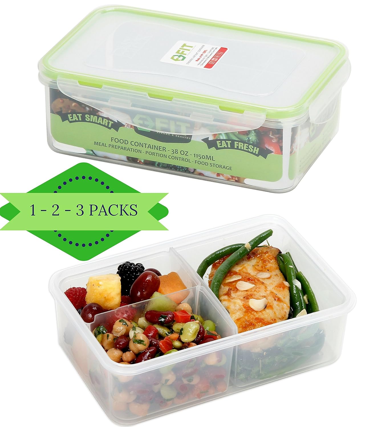Perfect for meal prepping multiple meals at once, freezing in the freezer, microwaving (no lid), then washing in the dishwasher (recommended top rack) before next use. Control your portions and count your macros! Our meal prep containers are airtight and leak-resistant. They can be reused more often than those made by many of our competitors. More details: Food-safe: only high-quality, food-grade virgin polypropylene is used. Toxin-free: contain no BPA, phthalates or toxic additives. Made in Ontario, Canada to strict FDA and CFIA guidelines. Microwave (no lid) & Dishwasher safe. Comes with our meal prepping ebook giving you tips, and recipes.the FIT, Strong & Healthy 1 - 2 - 3 Meal Prep Containers | 38 oz Premium Leakproof Bento Style Lunch Box | Portion Control | Configurable Removable Compartments | Reusable Food Container | Healthy Eating The innovative square shape of Easy Find Lids containers means more food storage can fit into your refrigerator, pantry or cooler at the same time. When empty, containers easily nest and stack.Find the right lid, right now! Featuring the Rubbermaid Easy Find Lids system, lids snap to the container base and other lids so that the right lid is always at your fingertips. The square-shape, graduated sized containers give you more space in the fridge or cupboard. Organizing your kitchen just got easier.FIT, Strong & Healthy 1 - 2 - 3 Meal Prep Containers | 38 oz Premium Leakproof Bento Style Lunch Box | Portion Control | Configurable Removable Compartments | Reusable Food Container | Healthy Eating is best for youPackage Quantity:1 | Size:38 oz LIMITED TIME OFFER - Reduced Price! Make Lunch Easy and Fun with the Best Bento Style Meal Prep Container by FIT, Strong & HealthyWe believe that you and your family deserve to eat full, healthy meals, even if time is tight. That’s why we engineered an elegant bento box to put an end to those little, wrinkly plastic sandwich bags. The ideal blend of function and style, this configurable meal prep container is designed to make healthy eating easy and fun! Customize Your Meals with This Configurable Lunch BoxFeaturing 3 configurable food compartments that can be easily removed or adjusted to suit your needs, this elegant Bento style container is a must have tool for healthy meal planning. The separate compartments are removable and interchangeable, offering you the freedom to customize your meals and keep your salad, fruit or sandwich separate. Ideal for packing kids’ lunch for school, athletes, or anyone who wants daily life to be that much better. Invest In High Quality, Durable Meal Prep Containers That Will LastDesigned to outlast all your old lunch boxes, this durable Bento style box will not warp or crack. Made of 100% BPA free, antibacterial PP material, this lunch box will perform excellently and go without a hitch for a long time. The airtight lid closure design keeps your lunch box securely locked, while the leakproof seal helps keep your snacks safely contained, saving you from the hassle of cleaning spilled liquids in your lunch bag. Store and Organize Your Office Supplies, Hardware and More! Exquisitely versatile, this multipurpose storage box can serve as a convenient organizer for your school or office supplies (pen, paperclips, memo pads for instance), hardware (nuts and bolts) or even pet food! Click “Add to Cart” Now, While Supplies Last