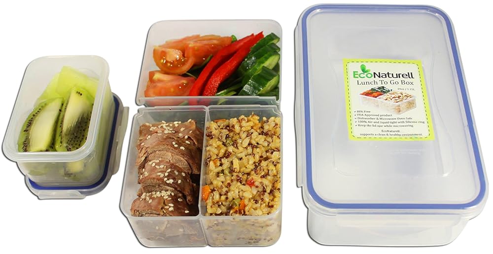 Perfect for meal prepping multiple meals at once, freezing in the freezer, microwaving (no lid), then washing in the dishwasher (recommended top rack) before next use. Control your portions and count your macros! Our meal prep containers are airtight and leak-resistant. They can be reused more often than those made by many of our competitors. More details: Food-safe: only high-quality, food-grade virgin polypropylene is used. Toxin-free: contain no BPA, phthalates or toxic additives. Made in Ontario, Canada to strict FDA and CFIA guidelines. Microwave (no lid) & Dishwasher safe. Comes with our meal prepping ebook giving you tips, and recipes.the EcoNaturell Bento Lunch Box - 3 Removable Compartments– Leak Proof Meal Prep Containers -BPA free -Food Storage containers for kids & adults, Ecofriendly Reusable Portion Control–Bonus Soup Container The innovative square shape of Easy Find Lids containers means more food storage can fit into your refrigerator, pantry or cooler at the same time. When empty, containers easily nest and stack.Find the right lid, right now! Featuring the Rubbermaid Easy Find Lids system, lids snap to the container base and other lids so that the right lid is always at your fingertips. The square-shape, graduated sized containers give you more space in the fridge or cupboard. Organizing your kitchen just got easier.EcoNaturell Bento Lunch Box - 3 Removable Compartments– Leak Proof Meal Prep Containers -BPA free -Food Storage containers for kids & adults, Ecofriendly Reusable Portion Control–Bonus Soup Container is best for youAre you looking to eat healthier, save money and lose weight? Start with the versatile and reusable style lunch box from EcoNaturell! Eating healthy has always been a challenge because fast food is so prevalent in today's society and taking your healthy foods to school or work was never easy. But now, thanks to the EcoNaturell Lunch To Go Box you can easily prepare healthy food in advance to ensure you maintain a healthy diet while saving money.Convenient, Easy to Use, DurableThe Lunch Box is designed using leak proof and airtight technologies that keep your food the perfect temperature to ensure it stays crisper, fresher and never spills. Using three unique compartments, plus the 180 ml leak proof container to keep food nicely separated, you can better manage fruits, vegetables, meats, snacks and even condiments without worrying about odors, stains or messes. In fact, it makes the premier tupperware meal prepping containers because it's also safe for the microwave and the dishwasher. Whether you’re taking the 21-day fix challenge, have a rigorous gym plan or simply want to save money by not eating fast food, our bento storage containers helps reinforce your positive, healthy lifestyle. Product Details: Three (3) Removable Compartments Plus Soup Container Portion Control Leak Proof Bento Box Enhanced Antibacterial and Durable PP Material Childrens, Kid-friendly Lids, Easy to Open Leak Proof, Airtight, Ecofriendly and Environmentally Safe, BPA Free- FDA Approved Order Includes : Lunch Box Size: 39 oz./ 1.15L Half container: 445 ml(15 oz.)Quarter container: 220 ml (7.4 oz.)Soup Container (180mL)(6 oz.) Save money and take control of your health, this versatile smart portable is made for the active lifestyle. Get yours today by clicking ‘Add to Cart’ above!.