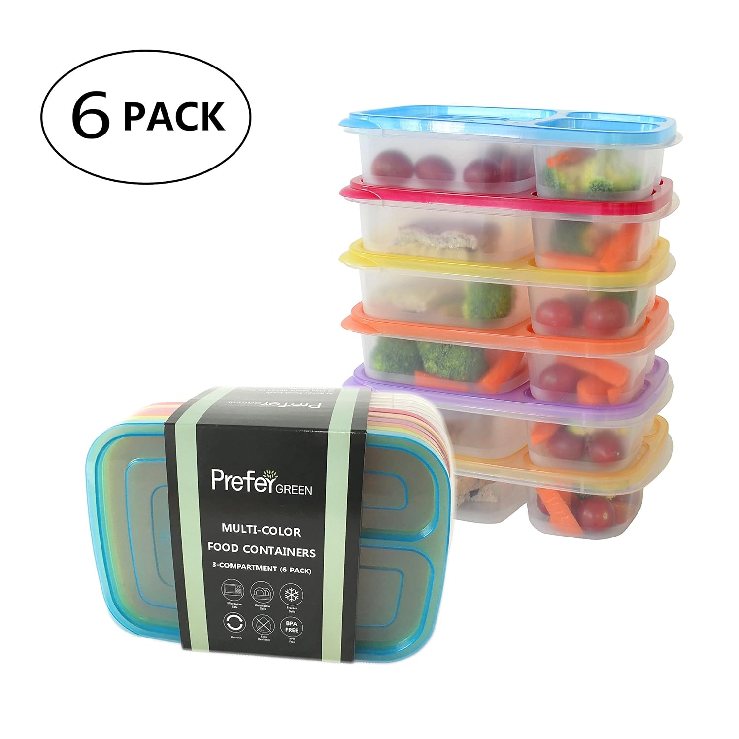 Perfect for meal prepping multiple meals at once, freezing in the freezer, microwaving (no lid), then washing in the dishwasher (recommended top rack) before next use. Control your portions and count your macros! Our meal prep containers are airtight and leak-resistant. They can be reused more often than those made by many of our competitors. More details: Food-safe: only high-quality, food-grade virgin polypropylene is used. Toxin-free: contain no BPA, phthalates or toxic additives. Made in Ontario, Canada to strict FDA and CFIA guidelines. Microwave (no lid) & Dishwasher safe. Comes with our meal prepping ebook giving you tips, and recipes.the Prefer Green 3-Compartment Bento Lunch Box Containers Multi Color Portion Control Containers with Lids (Improved Tighter) ,Set of 6 The innovative square shape of Easy Find Lids containers means more food storage can fit into your refrigerator, pantry or cooler at the same time. When empty, containers easily nest and stack.Find the right lid, right now! Featuring the Rubbermaid Easy Find Lids system, lids snap to the container base and other lids so that the right lid is always at your fingertips. The square-shape, graduated sized containers give you more space in the fridge or cupboard. Organizing your kitchen just got easier.Prefer Green 3-Compartment Bento Lunch Box Containers Multi Color Portion Control Containers with Lids (Improved Tighter) ,Set of 6 is best for youPrefer Green provid the high quality PP daily food container /lunch boxes for you. Each container is quality checked to be FDA-approved and free of BPA, PVC and phthalates. Prefer Green colored container [6 PACK] use guide:Dishwasher safe.Microwave safe.Stackable for children & adults.Portion control and healthy meal prep.Fits in the fridge and your gym bag.Fits in the fridge and your gym bag.