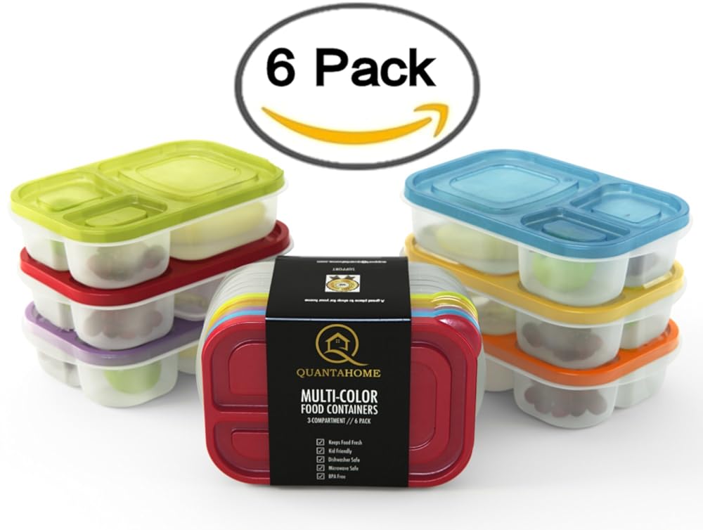 Perfect for meal prepping multiple meals at once, freezing in the freezer, microwaving (no lid), then washing in the dishwasher (recommended top rack) before next use. Control your portions and count your macros! Our meal prep containers are airtight and leak-resistant. They can be reused more often than those made by many of our competitors. More details: Food-safe: only high-quality, food-grade virgin polypropylene is used. Toxin-free: contain no BPA, phthalates or toxic additives. Made in Ontario, Canada to strict FDA and CFIA guidelines. Microwave (no lid) & Dishwasher safe. Comes with our meal prepping ebook giving you tips, and recipes.the Multi-color 6 PACK. 3 compartment reusable food storage containers-Bento Lunch Box set best for kids lunch & Meal Prep. Easy Storage, suitable for Freezer-Microwave and dishwasher. Premium BPA free The innovative square shape of Easy Find Lids containers means more food storage can fit into your refrigerator, pantry or cooler at the same time. When empty, containers easily nest and stack.Find the right lid, right now! Featuring the Rubbermaid Easy Find Lids system, lids snap to the container base and other lids so that the right lid is always at your fingertips. The square-shape, graduated sized containers give you more space in the fridge or cupboard. Organizing your kitchen just got easier.Multi-color 6 PACK. 3 compartment reusable food storage containers-Bento Lunch Box set best for kids lunch & Meal Prep. Easy Storage, suitable for Freezer-Microwave and dishwasher. Premium BPA free is best for youYour search for the perfect 3 Compartment Reusable Food Storage Containers is finally over. When you purchase the QuantaHome 3 Compartment Reusable Food Storage Containers today here's what you should do… When that brown box from Amazon arrives at your door, rip it open the first chance you get. Take out your QuantaHome BPA free meal prep containers. Take note of the design easily stackable for your convenience. ¥ The versatility of this product allows you to make Healthy meal choices for you and your family. The 6 pc set is awesome for meal prep, you can even use them for your kids lunches , fit them in lunch boxes, purse, refrigerators and freezers. Use for hot or cold food. What separates our food storage containers from the competition? It's simple really. It starts with the years of research that our team has spent meticulously analyzing the children’s lunch habits and analyzing the needs of those who are on diets or fitness programs. What came as a result is a food storage container crafted with the sturdy and only the most premium materials, with a dedication to lightweight, a high-quality and colorful range, each rectangular box includes 3 individual dividers, so no matter what size your lunch, food items can be placed and packaged securely, quality and durability that is unparalleled by any of our competitors. For the sake of your high standards, buy only the best Meal Prep Containers on Amazon - and you're looking at it right now. It's because of this that we guarantee that you will be satisfied with our Meal Prep Containers and if you are not we will give you a 100% refund WARNING: the current price is scheduled to increase in the next few weeks, so ORDER NOW to secure our current price. see our images for more info.