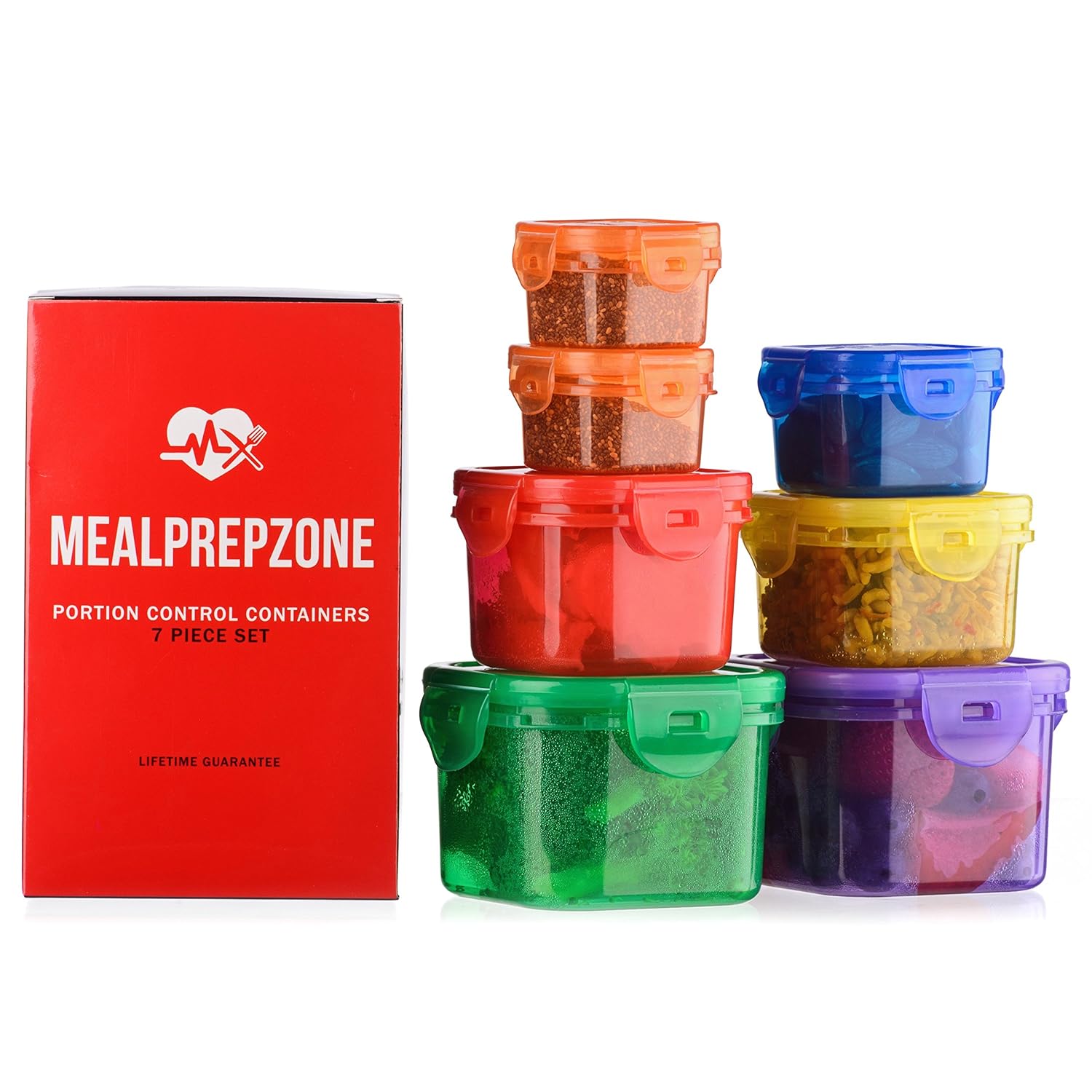 • The Meal Prep Zone 7 Piece Multi-Colored Portion Control Containers with Guide, Snap-Lids, Multi-Colored, Comparable to 21 Day Fix is a