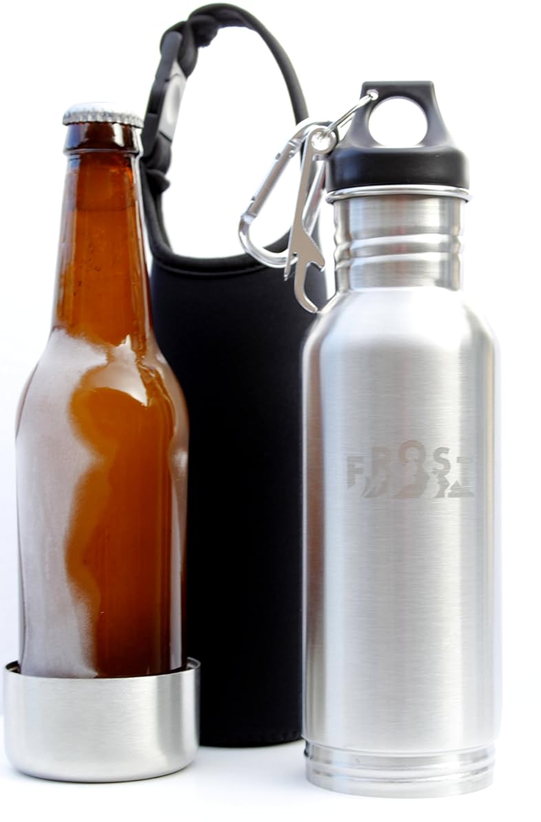 • The Stainless Steel Beer and Beverage Insulator + Cooler Complete Bundle Includes Neoprene Bottle Carrying Case + Opener + Carabiner - Fits Most 12 oz Glass Bottles by FROST Bottle is a