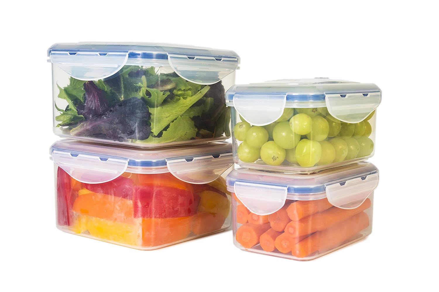 Perfect for meal prepping multiple meals at once, freezing in the freezer, microwaving (no lid), then washing in the dishwasher (recommended top rack) before next use. Control your portions and count your macros! Our meal prep containers are airtight and leak-resistant. They can be reused more often than those made by many of our competitors. More details: Food-safe: only high-quality, food-grade virgin polypropylene is used. Toxin-free: contain no BPA, phthalates or toxic additives. Made in Ontario, Canada to strict FDA and CFIA guidelines. Microwave (no lid) & Dishwasher safe. Comes with our meal prepping ebook giving you tips, and recipes.the StoreFresh Vacuum-Sealed Food Storage Container -- Set of 4, Locking Lids, BPA Free, Airtight The innovative square shape of Easy Find Lids containers means more food storage can fit into your refrigerator, pantry or cooler at the same time. When empty, containers easily nest and stack.Find the right lid, right now! Featuring the Rubbermaid Easy Find Lids system, lids snap to the container base and other lids so that the right lid is always at your fingertips. The square-shape, graduated sized containers give you more space in the fridge or cupboard. Organizing your kitchen just got easier.StoreFresh Vacuum-Sealed Food Storage Container -- Set of 4, Locking Lids, BPA Free, Airtight is best for youStoreFresh is proud to release this amazing new set of Food Storage Containers. These containers have everything you need--a vacuum seal, locking lids, high quality plastic construction, and a date indicator to record when food was stored. On top of all that, they look amazing! Inside each box: -2 rectangular containers, 600 mL/20 oz. -2 square containers, 1.25L/42 oz. -Instruction booklet *Comes with free e-book 'Recipes that Make Great Leftovers' -Great way to save money! Each lid has an indicator which helps you to keep track of the exact date you stored food in the container. Know exactly how old food is and waste less. -These containers are made of high quality plastic. Durable, BPA free plastic does not stain or color, and does not flavor food. -Food stored under a vacuum seal stays fresher for longer! A strong vacuum will inhibit bacterial growth. Keep you and your family safe from contaminated food! -No need for a pump. Pumps can get misplaced and are not convenient to use each time. To vacuum seal the containers, simply lock the lid into place and press down on the lid. -The locking lid forms an airtight seal. Never worry about spills or leaks. Even when held upside down or dropped, the lid stays securely attached and prevents spills. -These containers can be used in the microwave, dishwasher, and freezer. They are also BPA free! -Satisfaction Guaranteed. If for any reason you are not happy with this product, let us know and we will make it right! Please note: -Follow all instructions found in the attached instruction booklet for microwave, freezer and dishwasher use. -Food stored under vacuum have a longer shelf life, but natural bacteria/microbe growth will still occur at a reduced rate. -Keep out of reach of children. Small parts may break off and cause choking, leading to injury or death.