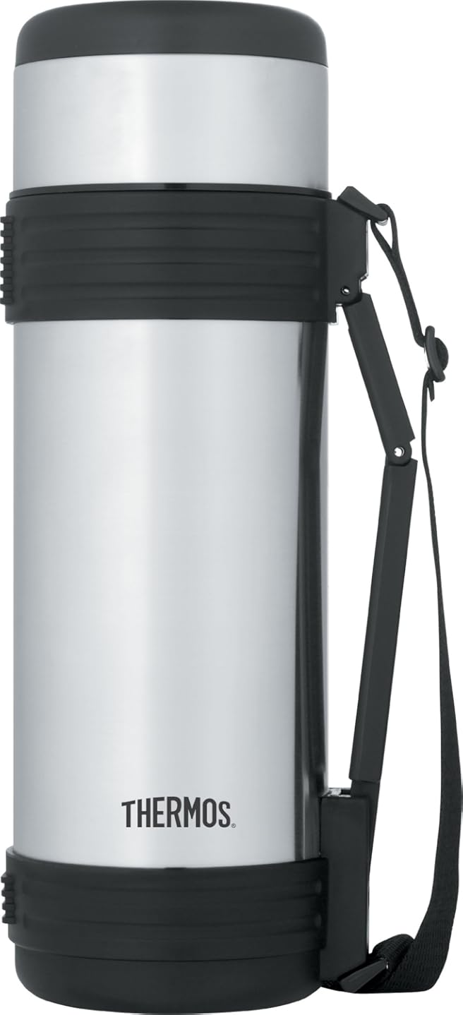 • The Thermos 34 Ounce Vacuum Insulated Stainless Steel Beverage Bottle with Folding Handle is a