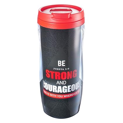 Black Geometric Star Polymer Travel Mug - Joshua 1:9 is best for youThe Black Geometric Star Polymer Travel Mug, with a bold designer artwork insert, has a pop-up open / close lid and holds 12 ounces of your favorite beverage for on-the-go enjoyment. The contoured shape of the body, and the non-slip base make for comfortable and secure handling. Fits most car and truck beverage holders. Features Scripture from Joshua 1:9, 'Be Strong and Courageous'.Hand Wash - Do Not Microwave