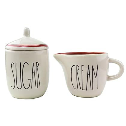 Cream & Sugar Stoneware is best for youWhite creamer with red interior and embossed with CREAM. White bowl with red accent around the lid and embossed with SUGAR.