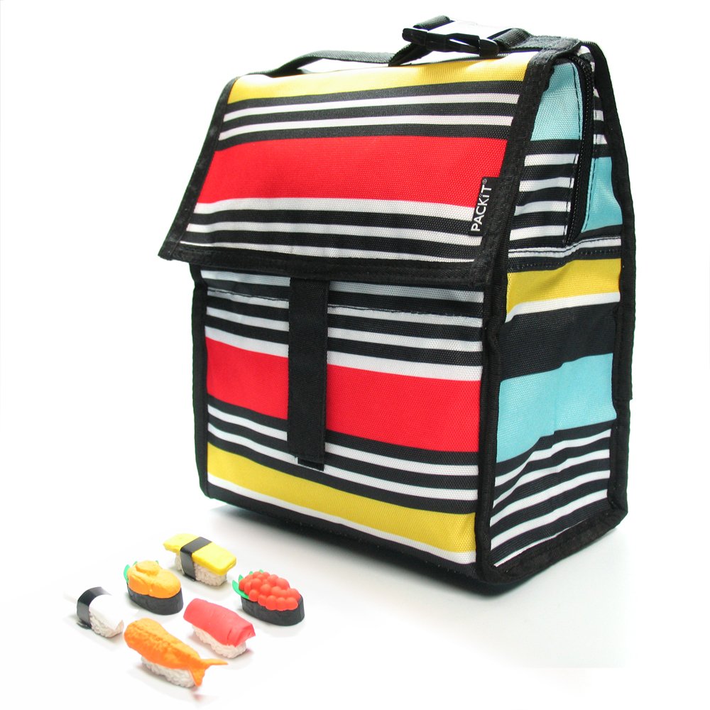 PACKIT Personal Cooler / Lunch Bag- Surf Stripe with 1 sushi eraser is best for youWith PackIt's fashionable Freezable Lunch Bags, you can conveniently take your lunch on the go without worry. The bags come with an adjustable carry handle and are lined with PackIt's patented freezable gel liners that keep your content cool for up to ten hours and that drop temperatures by 25 degrees with the first hour. You can now pack milk, yogurt, cheese, greens and leftovers from the night before without worrying about freshness. They are sealed water tight to prevents spills and the outer durable, hand-washable polycanvas come in many stylish designs.