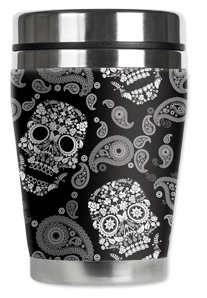 Mugzie White Sugar Skulls "Mini" Travel Mug with Insulated Wetsuit Cover, 12 oz, Black is best for youMugzie brand travel mugs combine the excellent insulation and water-proof properties of neoprene wetsuit material and the usefulness of a spill-proof, stainless steel travel mug. The Mugzie’s unique, hand-sewn fabric cover is made from 1/4 inch closed-cell neoprene that is covered with soft, water-proof polyester fabric. The stain-resistant cover is printed in hi-resolution and has full-wrap coverage. The Mugzie has excellent insulating properties to keep beverages hot or cold. The cushioned cover affords a secure grip and eliminates condensation and sweating. Mugzie travel mug fits in most car cup holders and the counter-weighted bottom provides stability. Use it for both hot and cold beverages. 12 Ounce Capacity. Features spill resistant lid and a non-skid bottom. Hand Wash. Made in the U.S.A. Patented. Free shipping by Art Plates or Amazon Prime.