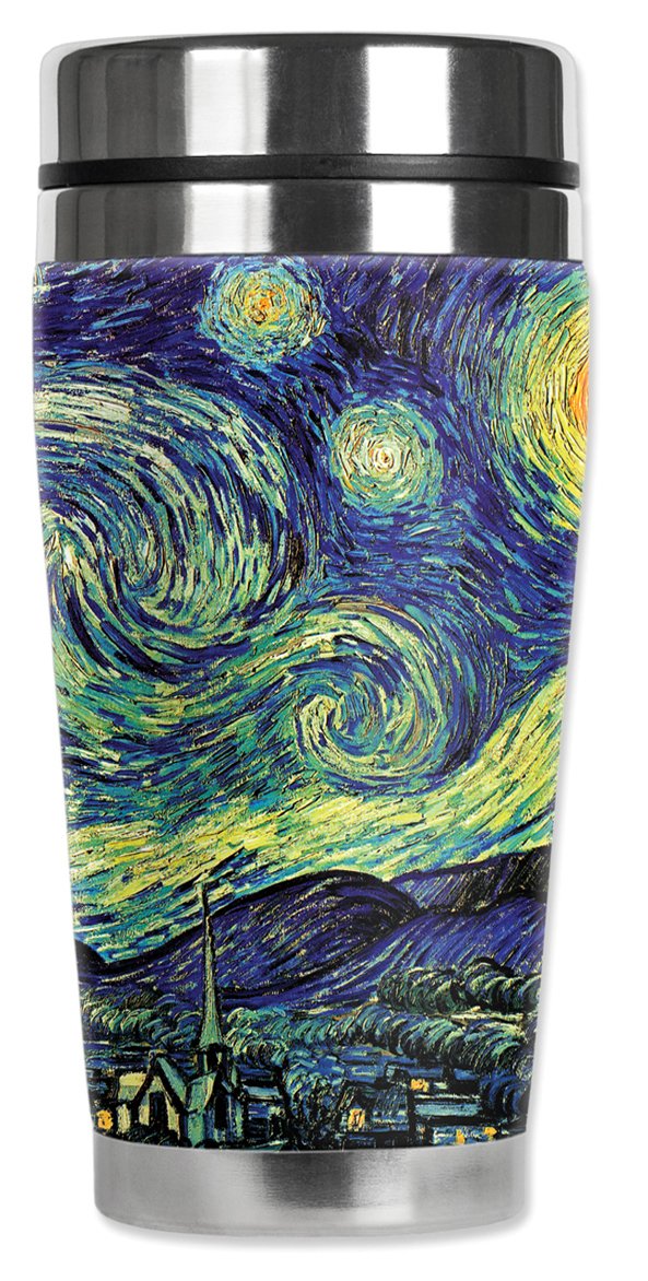 Mugzie 5-MAX "Van Gogh: Starry Night" Stainless Steel Travel Mug with Insulated Wetsuit Cover, 20 oz, Black is best for youMugzie brand travel mugs combine the excellent insulation and water-proof properties of neoprene wetsuit material and the usefulness of a spill-proof, stainless steel travel mug. The Mugzie’s unique, hand-sewn fabric cover is made from 1/4 inch closed-cell neoprene that is covered with soft, water-proof polyester fabric. The stain-resistant cover is printed in hi-resolution and has full-wrap coverage. The Mugzie has excellent insulating properties to keep beverages hot or cold. The cushioned cover affords a secure grip and eliminates condensation and sweating. Mugzie travel mug fits in most car cup holders and the counter-weighted bottom provides stability. Use it for both hot and cold beverages. 20 Ounce Capacity. Features spill resistant lid and a non-skid bottom. Hand Wash. Made in the U.S.A. Patented. Free shipping by Art Plates or Amazon Prime.