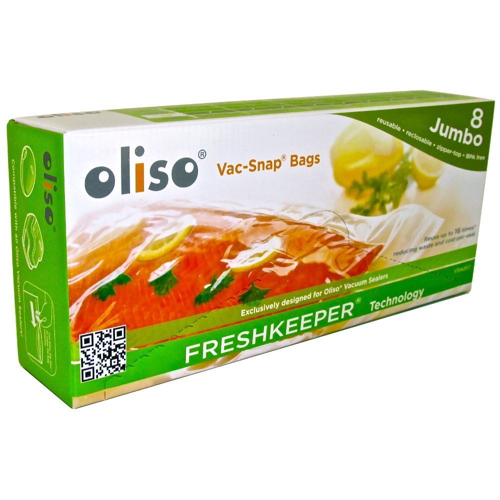 Oliso 8 Jumbo (2 gallon) Vac-Snap Bags - reusable zipper-top reclosable BPA free vacuum bag is best for you• Vac-Snap Bags - Jumbo (8/ct) Freshness in a snap! • Vac-Snap bags are reusable*, zipper top, multilayer bags that keep food fresh up to five times longer! • Eco-Friendly Storage Bags: Airtight, multilayer bags keeps air out and freshness in; reduces food waste Zipper-top for easy access. • Jumbo Vac-Snap bags are reusable up 16 times! • BPA-Free & #7 recyclable. • Versatile: For refrigerator, freezer or dry good storage. • Portion foods in advance One-time microwaving, simmering and sous vide cooking. *Reuse not recommended for raw fish, meat, poultry or greasy foods. • 'I love being able to take this vacuum bag on a day trip, eat some, then just Zip it shut to keep it fresh all day. Then when home, I can even do a full vacuum on it again.'