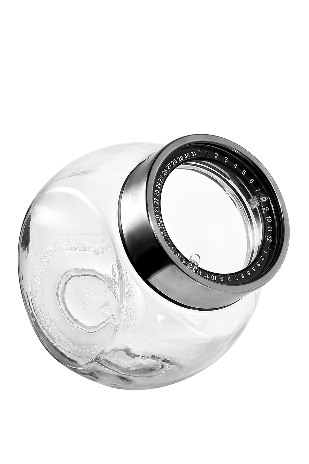Glass Storage Jar with Stainless Steel Date Dial Lid 1735mL(580z) by Juvale is best for youClear glass storage jar with elegant twist design. Stainless steel screw on lid with date dial to keep track of food's expiration date. Air tight lid keeps food fresh longer. Air tight lid keeps food fresh longer. Approximately holds 1.5qt.