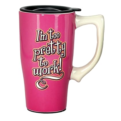 Spoontiques Too Pretty to Work Travel Mug, Pink is best for youThis Ceramic Travel Mug is perfect for anyone on the go! With a locking lid and a skid plated bottom this mug is the perfect travel companion. The double wall insulation keeps drinks hot or cold and it is both microwave and dishwasher safe.