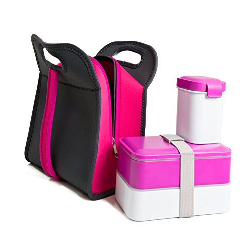 Complete Bento Lunch Box Set with Neoprene Lunch Bag - 6 Piece Set Including of 2 Lunch Box Containers, Full Set of Cutlery and Spill-proof Cup. BPA-free is best for youCongratulations! You've found your perfect solution for storing and carrying food on the go. Create-and-pack great breakfasts, tasty lunches, delicious main meals and tempting snacks in this complete solution for bringing your favorite food with you. The snap-shut/leak-proof cup will hold 11oz of drinks, fruit or soup and can be used in the microwave (excluding the lid), as can the two large Bento lunch containers (excluding lids) which have plenty of space for full size portions. They also have inner airtight lids to keep the food nice and fresh. The set comes with its own cutlery set of a knife, fork and spoon for your convenience, as well as a thick elastic band to secure the stacked Bento boxes together. All three containers are also freezer safe and dishwasher safe if washed in the top tray. The stylish neoprene bag, which can be hand held as a tote or over slung over the shoulder with the extendable loop, keeps it all together and can be washed in cold water. The plastic containers are BPA free and food grade plastic.
