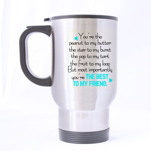You're the Best To My Friend/ Friendship Mug/ Mug for Friend- Funny Travel Mug 14oz Coffee Mugs or Tea Cup Cool Birthday/christmas Gifts for Men,women,him,boys and Girls- is best for youCool style coffee mug when you're on the go with our stainless steel travel/commuter mug. This spill-proof commuter mug has a removable plastic top and looks good adorned with your favorite picture or text. - Hand wash only. - Tight Snap-on lid that will not come off even if you accidentally knock the cup over. - The slide lock on the lid is not 'leak proof' but will not allow liquid to splash around when locked even when walking with the mug. - You will thoroughly enjoy carrying and using this attractive, custom travel mug when on-the-go. - It's 14oz size will give you enough capacity to enjoy a full cup of coffee, tea or whatever your favorite beverage is when you are on the road. - Hand washing is recommended. Features You Will Come To Love When Carrying And Using Your New Coffee Travel Mug: - Attractive And Distinctive Design - Stylish Stainless Steel Outer Container - Well Fitting Snap -On Lid With Convenient Easy To Use Splash Prevention Slide Lock You can also customize the mugs with your creative idea. Just contact us, we will respond you within 24 hours.