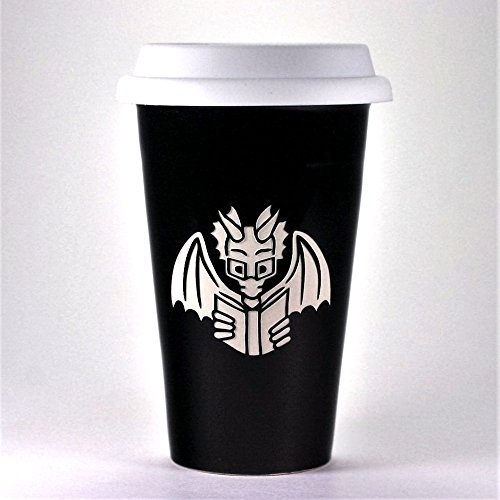 BOOK DRAGON Travel Mug - BLACK - Double Wall Ceramic Stoneware is best for youMicrowave-safe and dishwasher-safe. We carved all the way through the shiny glaze of this double walled reusable ceramic travel mug so that the bold natural stoneware can be seen. Includes white silicone lid. Other colors may be available.