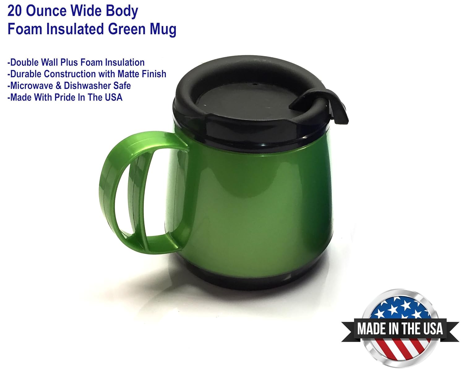 20oz. Foam Insulated Wide Body ThermoServ Mug- Green is best for youA good coffee mug is like a comfortable pair of Jeans or your favorite boots it just feels 'right'. For years the 20 oz Wide Body mug was available at most Gas Stations and Convenience Stores. A few years ago they suddenly disappeared from the market and haven't been seen since. Well, we found the mold and arranged for a special production run of mugs. The Thermoserv mugs are great. They are double wall insulated and unlike other mugs on the market, they are foam filled so they are far superior at keeping drinks hot or cold. These rugged mugs are both dishwasher and microwave safe. The lid snaps on tight and has a spill-resistant slide cover for the drink hole. The mug has an ergonomic handle and a skid resistant base. It is green in color with a black top. There is no printing or graphics on this mug.