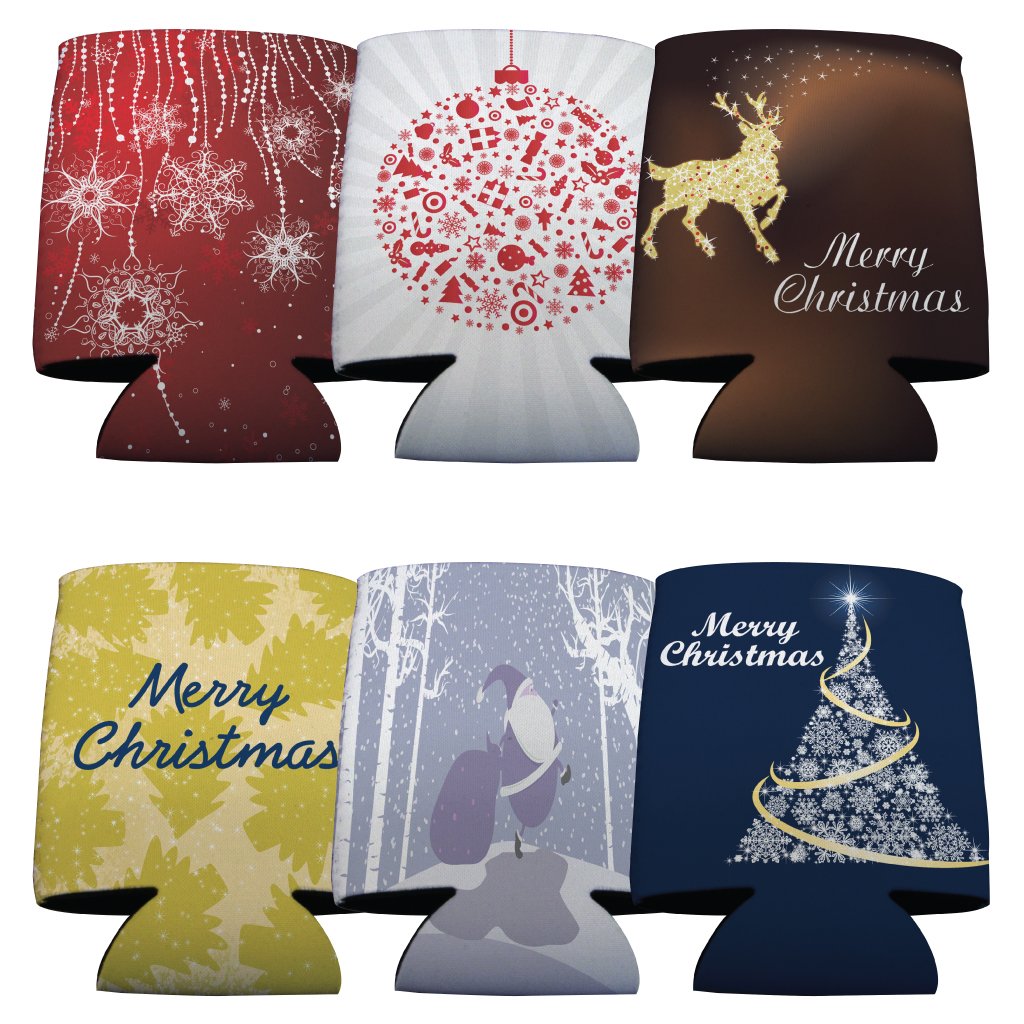 Christmas Themed Can Cooler Set - 6 Designs - Set of 6 is best for youChristmas Themed Can Cooler Set holds 12oz or large cans or bottles. Our one of a kind designs are great for Christmas parties! White outer surface adhered to inner neoprene (TM) rubber insulator. Fold-able with sew seams and slotted bottom. Order a Can Cooler set of 6 today!