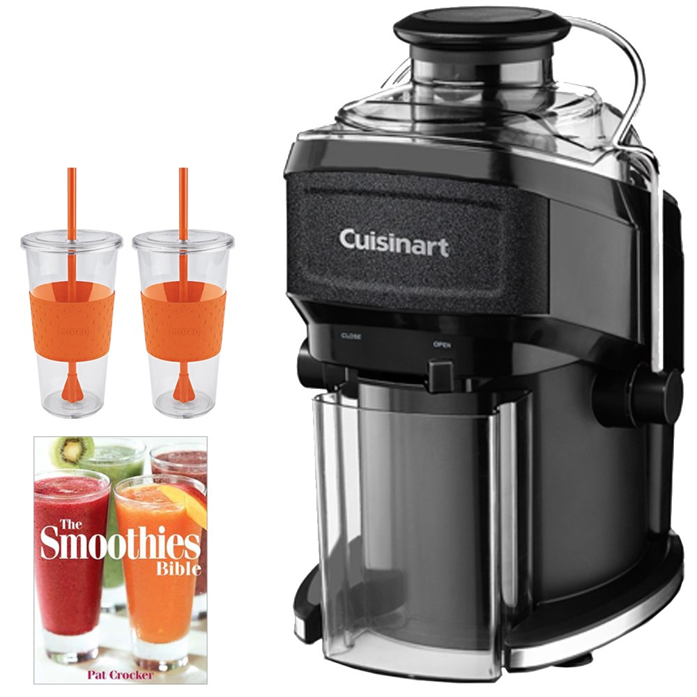 Cuisinart CJE-500 Compact Juice Extractor with Bundle Includes, Pat Crocker The Smoothies Bible (Paperback) & 2x Copco Eco First Tumbler 24 Ounce Togo Cup Mug - Orange is best for youPeople are not only eating healthier, they're drinking healthier, too! Now Cuisinart helps them do it without giving up too much counter space. The Compact Juice Extractor turns fruits and vegetables into tasty and nutritious juices in seconds with the touch of a single button! Features Powerful, easy and quiet operation One-touch operation of on/off push button with blue LED makes juicer easy to use Juice Pitcher holds up to 16 ounces of juice, and can be replaced for uninterrupted juicing Pulp container collects up to 40 ounces and is removable for easy cleaning Food Pusher fits securely into feed tube to guide fruits and vegetables properly while juicing Cover with large feed tube minimizes prepping and pre-cutting Adjustable flow spout is manually controlled and prevents dripping Mesh filter basket and blade assembly grinds fruits and vegetables to extract maximum amount of juice; easily separates pulp; is removable for simple cleanup Safety bar must be up and locked over cover for juicer to operate Cleaning brush BPA free