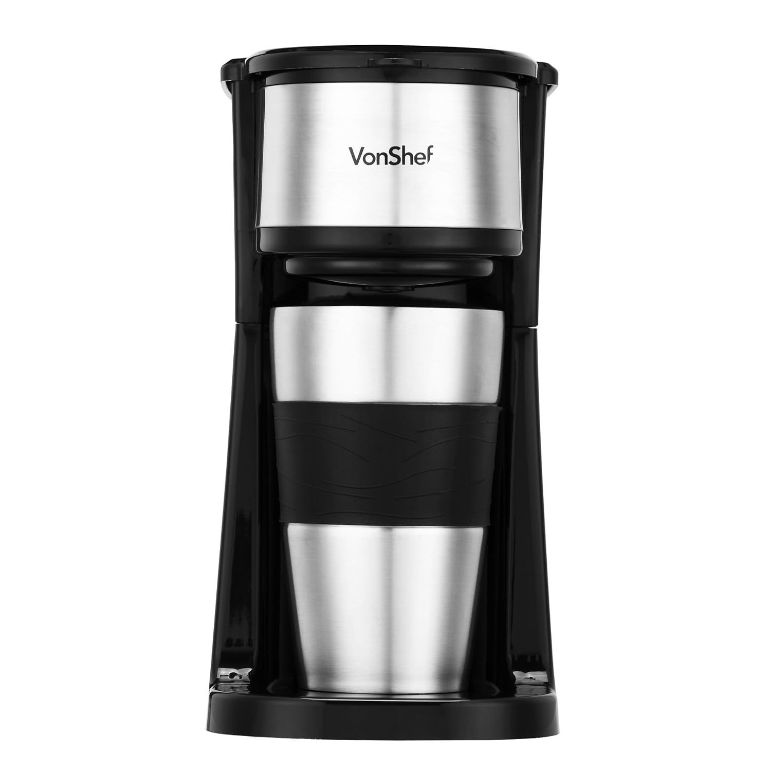 VonShef Single Serve Personal Filter Coffee Machine with 14oz Travel Mug & Lid is best for youBrew a personal cup of coffee with the innovative VonShef One Cup Coffee Machine. No more time wasted waiting for a full pot to brew, expensive cafes or settling for tasteless instant coffee - the One Cup Coffee Machine lets you get your caffeine fix quickly and conveniently. Thanks to its compact design, this versatile machine is perfect for use at home, at work or on holiday - you’ll never be far from your favorite coffee. The Coffee Machine comes with a handy 14oz BPA-free travel mug with silicone grip and lid, so you can enjoy warm coffee on the move. Fits into most car cup holders. Easy to use one touch operation dispenses coffee directly into the mug. Simply fill the water tank, add ground coffee to the reusable mesh filter, power up and piping hot coffee will be dispensed in just 5 minutes. Indicator light lets you know when the machine is in use. Stylish black / stainless steel finish. Removable parts are dishwasher safe. Dimensions: 11 x 6 x 5 inches. Power: 650 - 750 Watts.