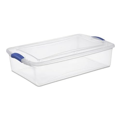 34-Quart Capacity, See-Through Lid Latch Storage Box, Case of 6, Clear is best for youThe Sterilite 34-Quart Latch Box, Stadium Blue, Case of 6 features a heavy-duty closure to keep contents secure. Both the lid and base of this item are clear for easy identification of possessions. The lid of the Sterilite latch box is indexed to maximize storage space with secure stacking. The wide, shallow profile of this item makes it ideal for storing everyday items under a bed. The shape is also suitable for bathroom or laundry room use