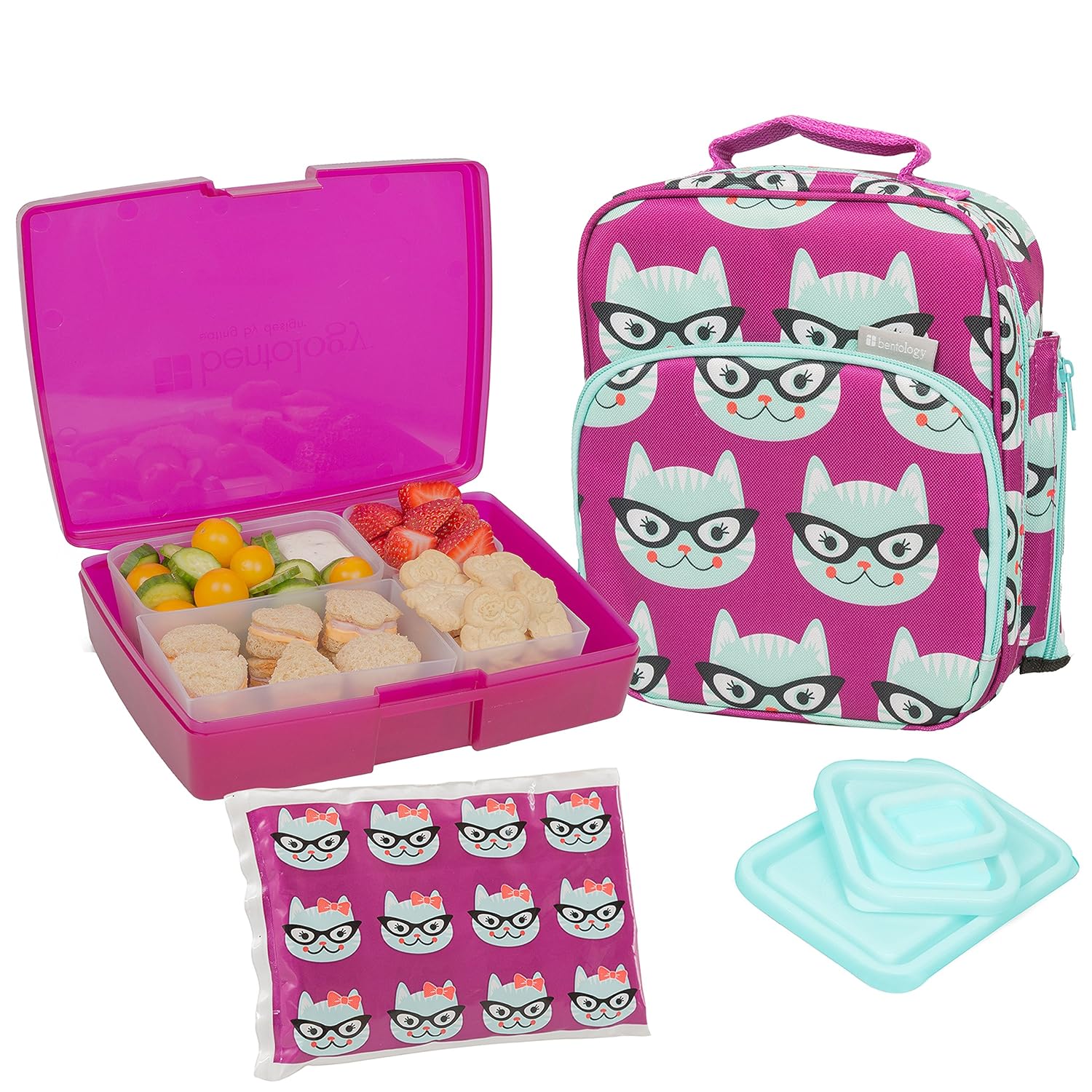 Bentology Lunch Bag and Box Set for Girls - Includes Insulated Bag with Handle, Bento Box, 5 Containers and Ice Pack - Kitty is best for youBentology Lunch Bag and Box Set - Includes Insulated Bag with Handle, Bento Box, 5 Leak Proof Containers and Ice Pack - Kitty Design -- This bento Lunch kit is perfect for school and travel! It comes with everything you need to get started on packing your favorite on-the-go meal! The stylish insulated bag is reusable and durable--it keeps food fresh and tasty. The bag holds more than just your bento lunch box. The multiple compartments can be used to store a drink bottle (not included), additional snacks, and so much more! It is fully insulated and the interior lining wipes clean easily. The exterior is 100% polyester and durable. The handle make the kit easy to carry around-- the interior mesh pocket with velcro closures holds an ice pack with a matching chic design that fits perfectly inside the bag. The bento box comes with a translucent raspberry outer container, translucent inner lunch containers and 3 ice blue leak-proof lids. Lids and containers can be used on their own or in the bento box--you can mix and match the containers and pack anything you want. The outer container closes tightly over the containers even without the lids. The bento box is durable, reusable and easy to clean. Bentology makes having a heathy on-the-go meal easy! Made in the USA. Contains no lead, bpa, phthalates, or pvc.