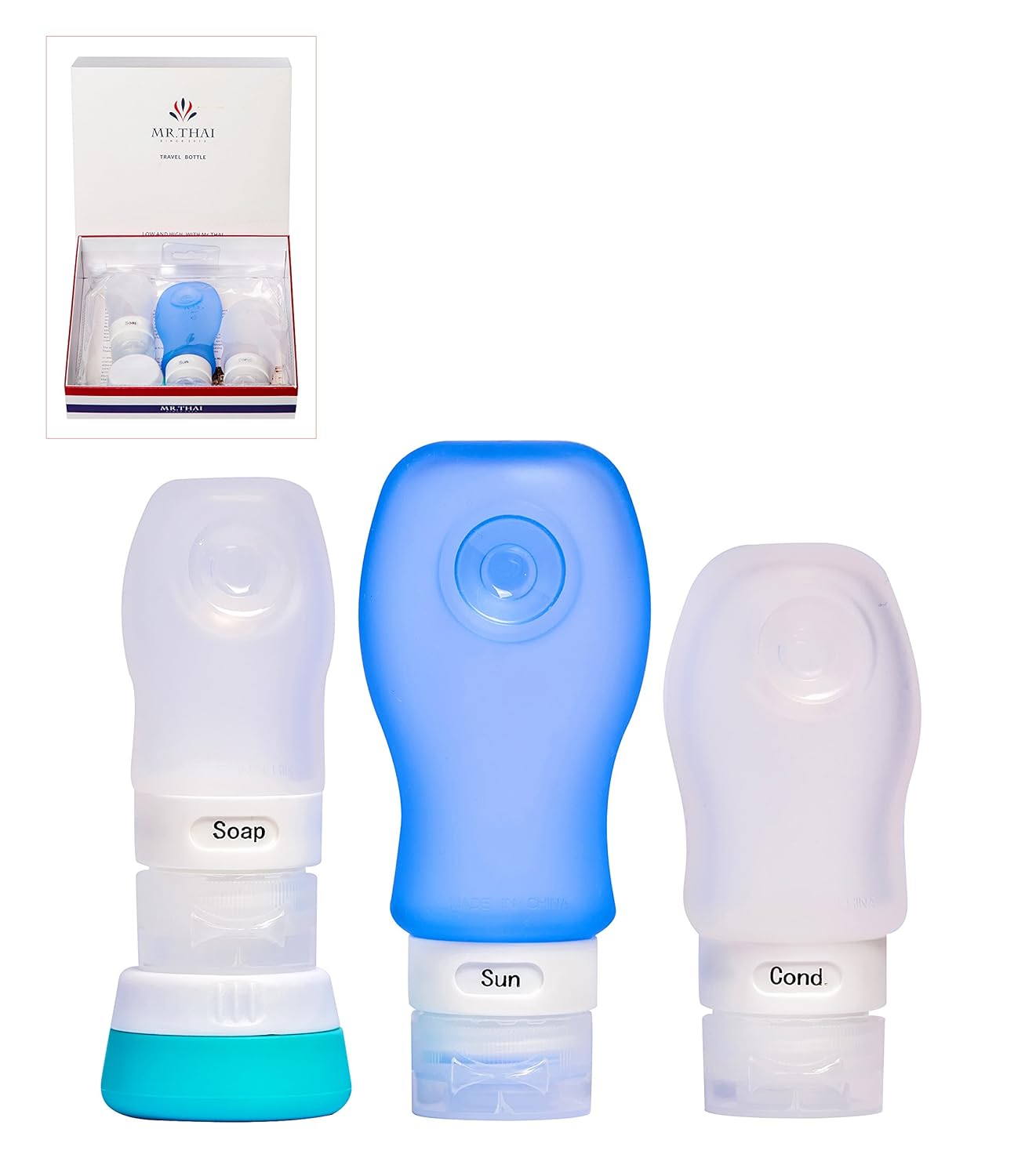 Silicone Travel Bottle Set (3oz/2oz/1.25oz, 3 Pack and 1 Cream Jar), Refillable Travel Bottles and Containers for Shampoo, Conditioner, Lotion - Leak roof, TSA approved, BPA-free is best for youFor Mr.Thai silicone travel bottle set you should know: ① Our travel bottles select 100% food-level silicone as raw materials, which can even meet the requirements on loading foods. ② In order to enhance user experience on official business, traveling, outdoor activities and other occasions, we have added leak proof design, which can effectively prevent the liquid leakage (no leak) with strong flip top, at the same time making the liquid squeezing become more convenient and easy. ③ The suction hanging system lets travel bottle be perfectly adsorbed in ceramic tile, wood and other smooth surfaces to make ready fetch and placement become possible. ④ The ID design allows you to change labels according to demands, thus easily identifying the liquid in the bottle. ⑤ Mr. Thai travel bottles contain three different specifications (3oz,2oz,1.25oz) to fully meet your travel needs of carrying fluids of different volumes, which is perfect for Shampoo, Conditioner, Lotion and etc. They are equipped with a cream jar, and a practical, durable, waterproof Carry On Clear Toiletry PVC travel bag. ⑥We offer a 30-day product return, lifetime warranty services and valuable customer relationship maintenance. About any problem you can consult and contact us. PLEASE go hand in hand with us! Let you have EXQUISITE travel free from worries.
