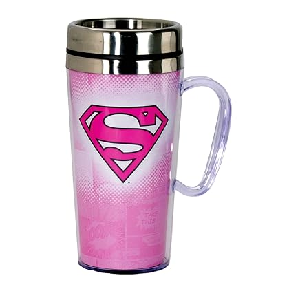 DC Comics Superman Pink Logo Insulated Travel Mug, Pink is best for youThis Insulated Travel Mug is great for anyone on the go. It holds 15 ounces and keeps your drink warm or cold with the double walled, stainless steel inner wall. With a sliding lock lid and skid platted bottom it's a fantastic travel companion! Hand wash.