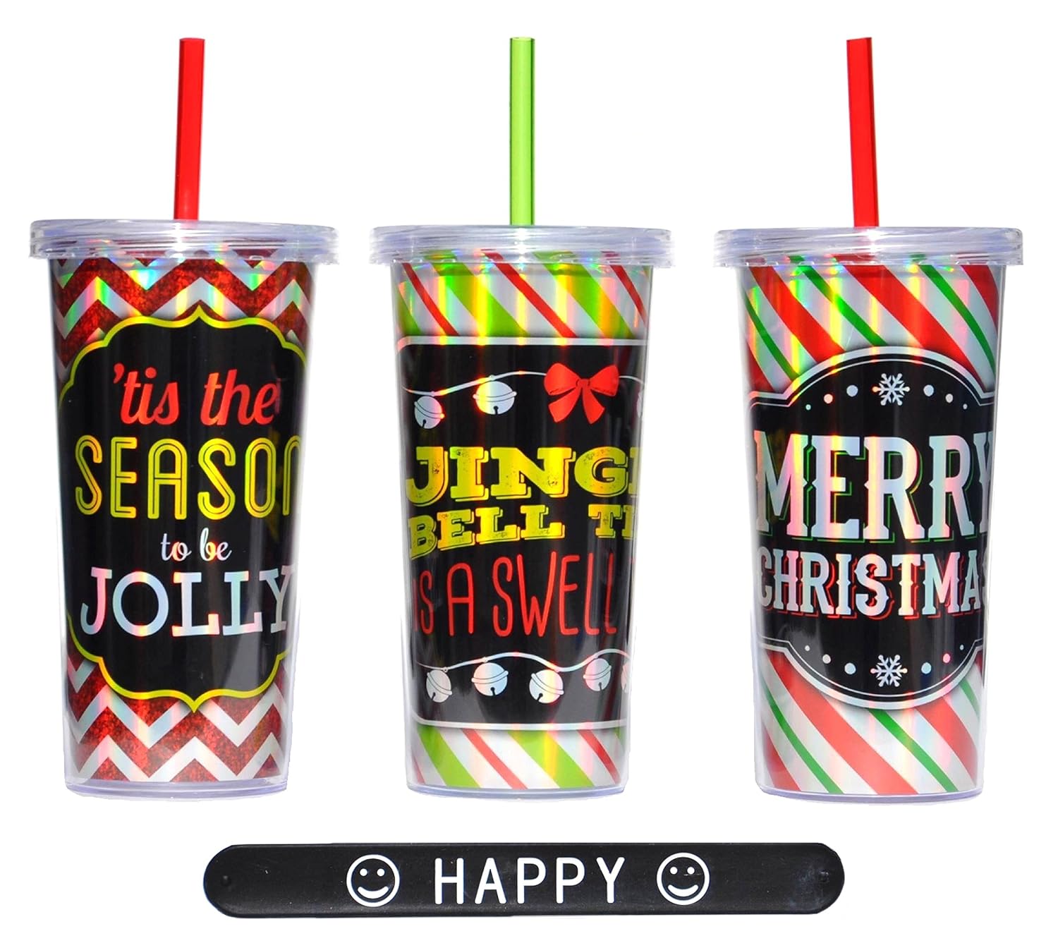 SETof3 Christmas Holiday Acrylic Double Wall 20 Oz Tumbler with Lid and Straw & HAPPY Slapstick Easter Basket Stuffer Gift Teacher Teen Her Him is best for youCelebrate the winter season with this set of three adorable, colorful mugs. Double walled to keep your beverage the right temperature. Each mug has a different holiday saying. Made of durable plastic. These make great teacher gifts - if you can bear to give them away. Each set of three comes with a colorful HAPPY slapstick. There are assorted colors, please allow us to select one for you. Note: It is only the slapstick that has assorted colors. The mugs come as pictured - you get all three colors!