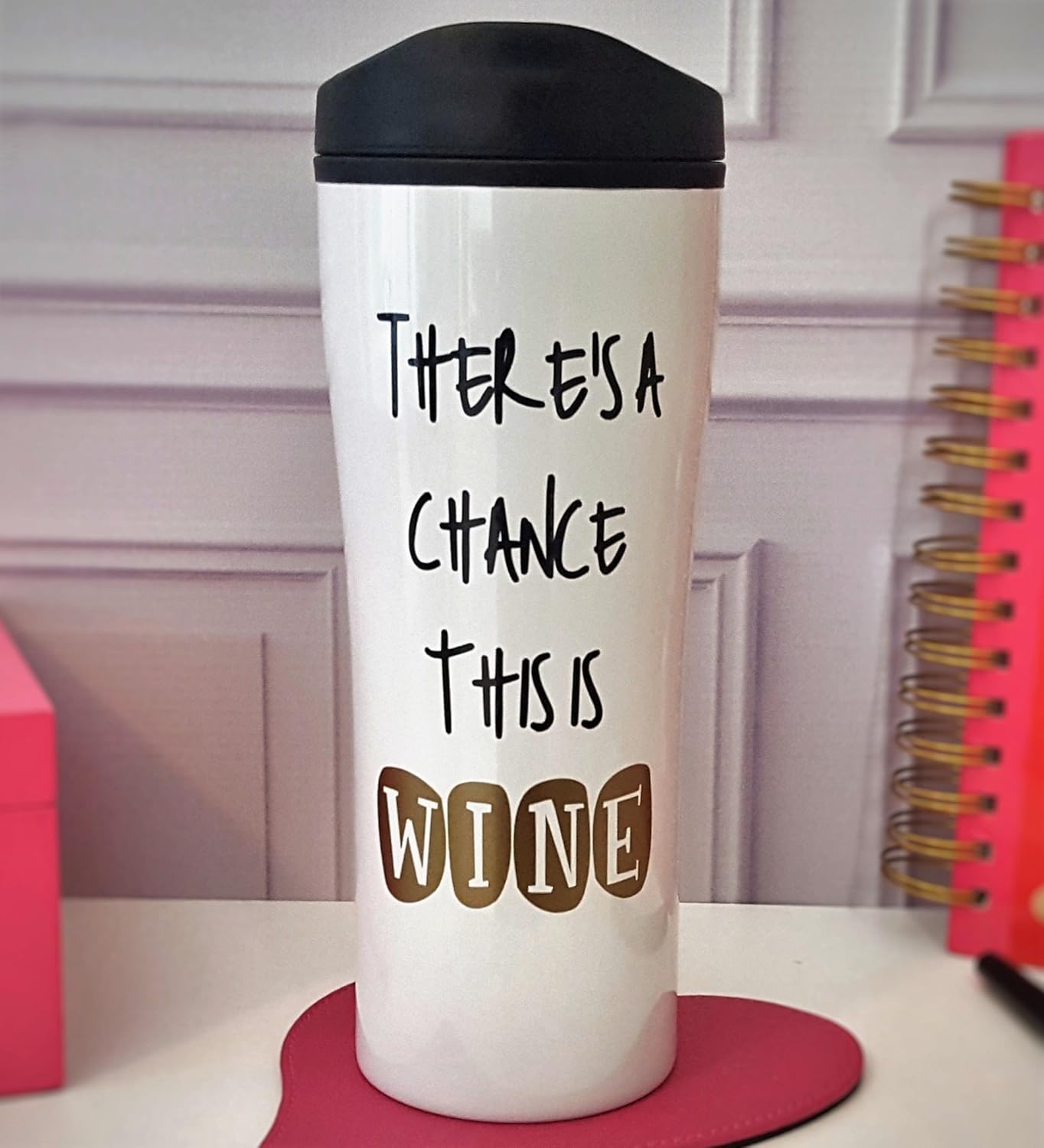 There's a Chance this is Wine Travel Mug - To Go Cup - Glitter Cup - Coffee Thermos - Travel Coffee Cup is best for youThere's a chance this is wine travel mug. ATTENTION! BIG NEWS! As of now, we are now carrying a new line of travel mugs. We have upgraded to an 18-ounce metallic travel mug. It is stainless steel on the outside and plastic on the inside. It is white with a black slide open/close lid. We are so excited that you are able to experience this enhancement to our travel mug! __________Let me tell you why I love these travel mugs, and yes I use one myself. They are sturdy and spill proof. I am actually a clumsy person, so this cup was made for me. It holds just enough of my favorite drink. The shape of the travel mug is easy to handle and fits in a cup holder perfect. PLUS, it saves me a ton of money because I'm not buying coffee at a store every day. ________________ ♥ 18oz ♥ White travel mug with black screw on slide open/close lid ♥ Made of Stainless Steel & BPA-FREE Plastic ♥ Hand wash ♥ Only high quality outdoor vinyl is used. Made too last. ♥ Please no scratching or picking at the design.•••Happy Shopping xoxo-Erin