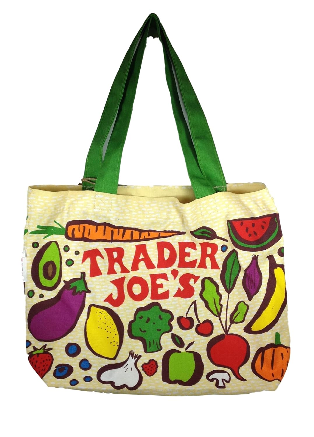 Trader Joe's Heavy Duty Cotton Canvas "Fresh Produce" Bag is best for youGreat for everyday use, shopping, beach, and more! Vivid colors and fun design. Machine wash cold with like colors, lay flat to dry. May shrink slightly and fabric colors may run.