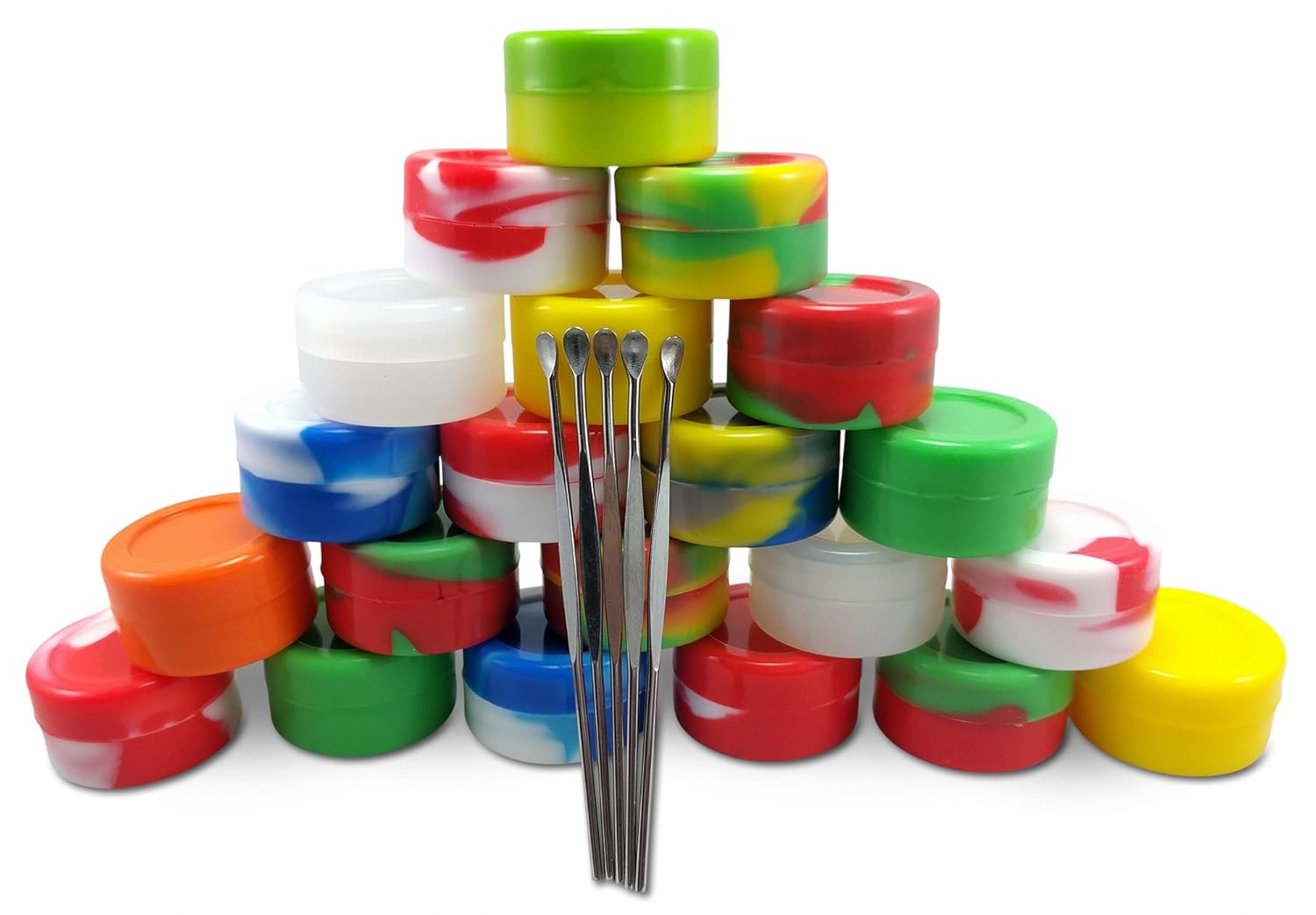 20 Nonstick Silicone WAX DAB Container , For Oil Wax Concentrate + FREE dabbers and extra smaller jar (20) is best for youSize:20 Try our NEW 20 Pack 22ml Dab Wax non-stick Silicone Container! Product Details: 20 (5ml) non-stick silicone wax jars High Quality Food Grade Silicone, FDA Approved, BPA Free Easy to use and clean Heat and freeze resistant, microwave safe, dishwasher safe, odorless Included: 20 (5ml) non-stick silicone wax jars (1.25' x 0.7' inches) FREE 5 Steel wax dabber ► Will fit all of your storage needs! Colors of Silicone are Random Click 'ADD to Cart' Above