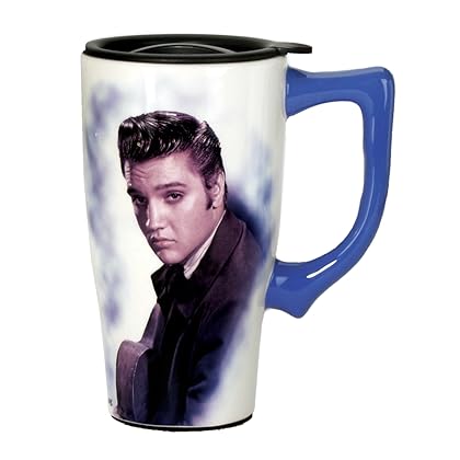 Elvis Presley Travel Mug, Blue is best for youThis Ceramic Travel Mug is perfect for anyone on the go! With a locking lid and a skid plated bottom this mug is the perfect travel companion. The double wall insulation keeps drinks hot or cold and it is both microwave and dishwasher safe.