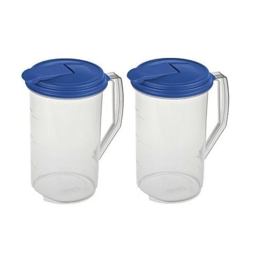 Sterilite 2 Quart Round Plastic Hinged Pitcher, Sky Blue Lid | 04864106 is best for youPackage Quantity:2 The Sterilite 2 Quart Round Pitcher is a see-through plastic pitcher that every household could use. This pitcher makes it easy to mix drinks inside it without using an utensils. Measure ingredients by the graduated measure marks on the side of the pitcher and shake the pitcher lightly with the leak-proof lid attached. Serve up fresh drinks in seconds. The lid of the round pitcher has a hinged flip-top tab that stays open and out of the way when you pour your drinks. The pitcher and lid are easy to clean and are both BPA and phthalate-free. For a great little pitcher that you can make drinks in without utensils, get the Sterilite 2 Quart Pitcher.
